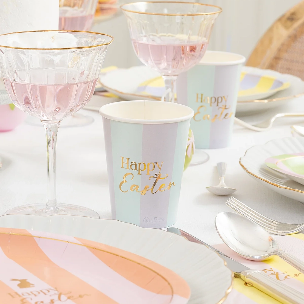 Set di bicchieri da 250cc ideali per celebrare la Pasqua con stile. Caratterizzati dall'elegante scritta "Happy Easter" in oro su design a tema Easter Bunny, sono la scelta perfetta per chi cerca un prodotto raffinato e totalmente privo di plastica 8pz.