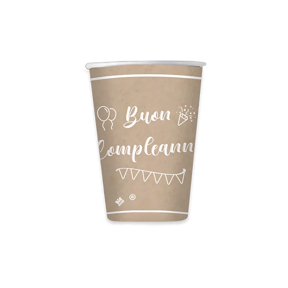 Bicchieri Big Party Buon Compleanno Kraft 200cc in carta, confezione da 8pz.