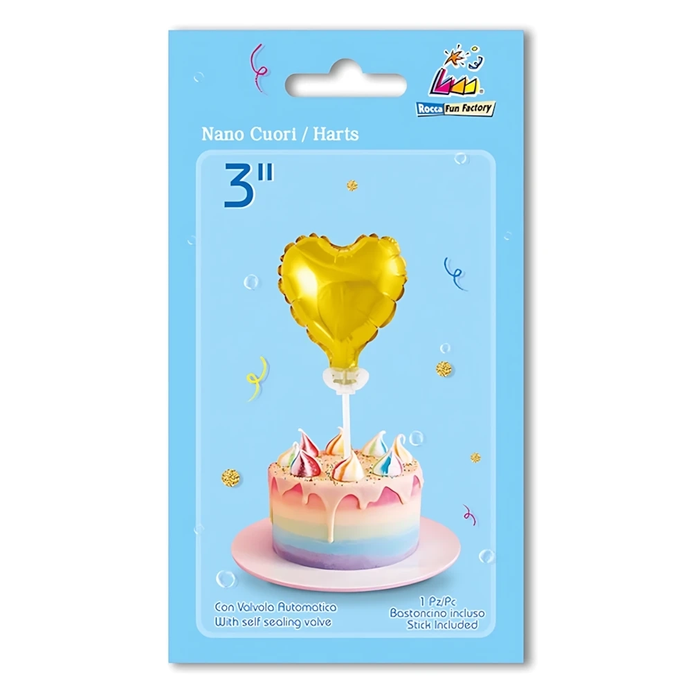Palloncino Rocca Fun Factory Nano Cuore Oro con bastoncino in mylar/foil, dimensione 3" (7cm), confezione da 1pz.